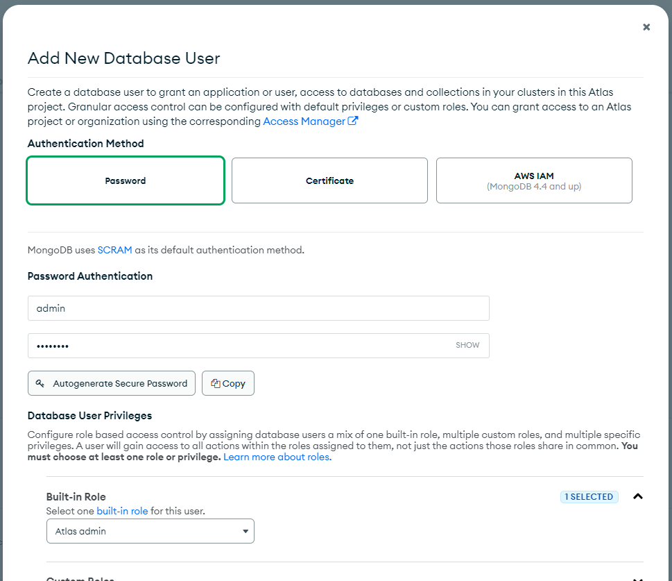 주의점 - Built-in-Role > Atlas admin 선택 (nodejs로 DB접속가능)