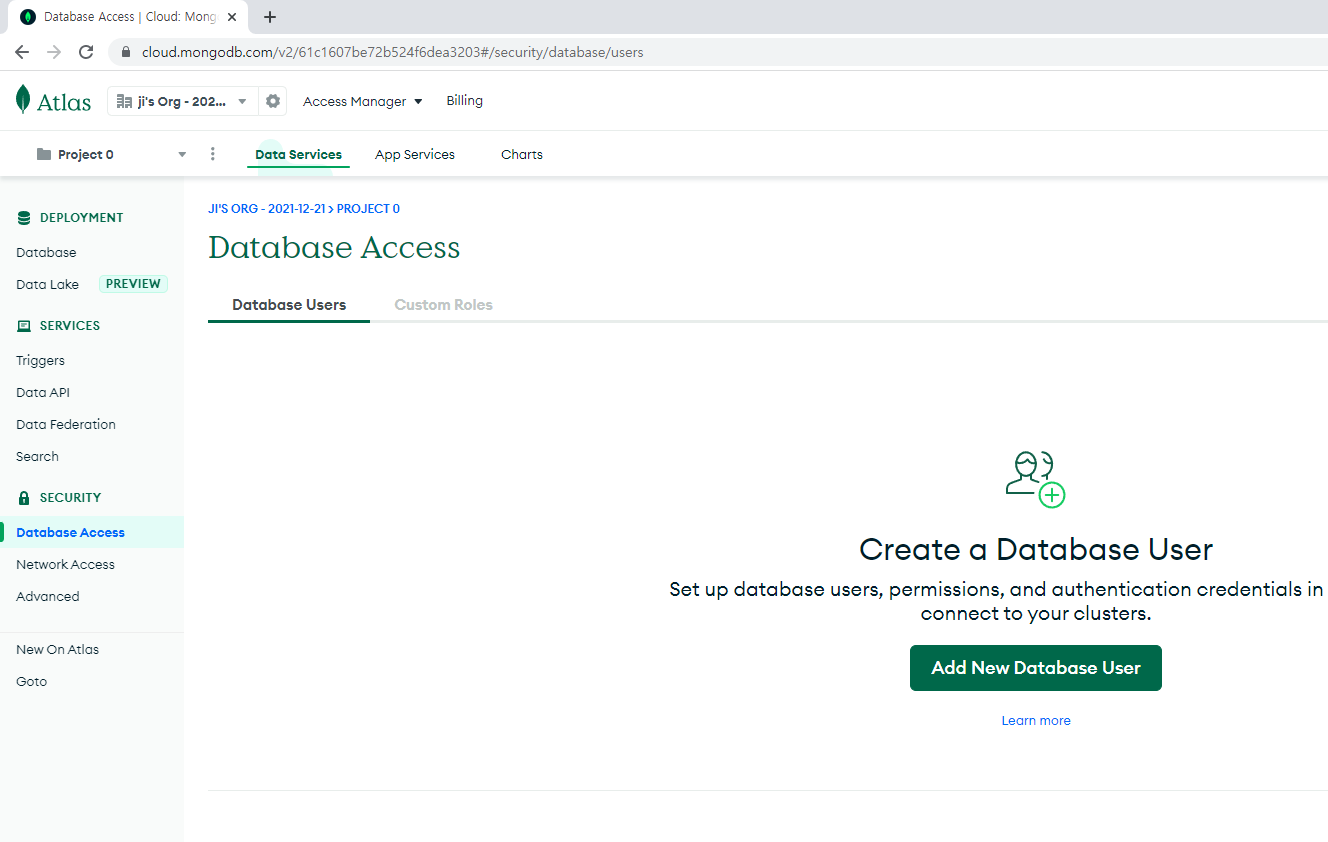 Database Access 메뉴에서 DB 접속용 아이디/비번을 생성
