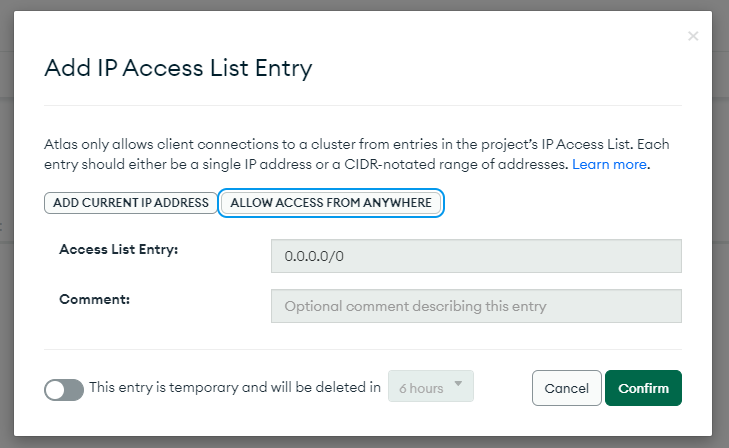 Allow access from anywhere을 누르거나 0.0.0.0/0